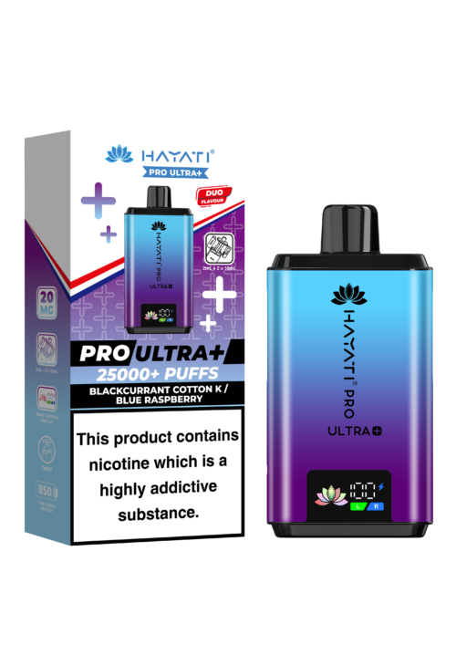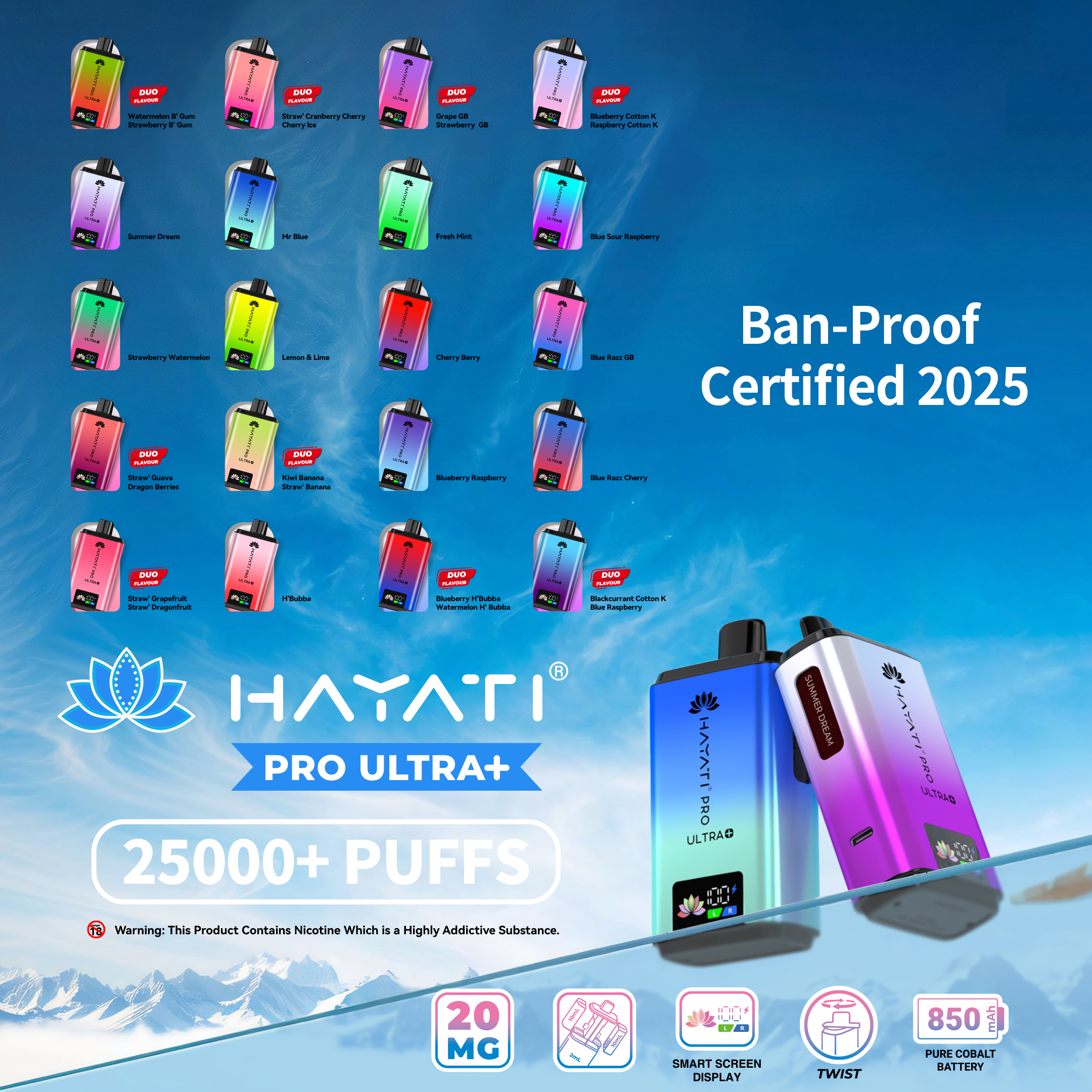 Hayati Pro Ultra Plus Vape Kit delivers 25,000+ puffs with dual 10ml flavour pods, 850mAh rechargeable battery, and smart LED screen. 20mg nic salt. TPD legal.