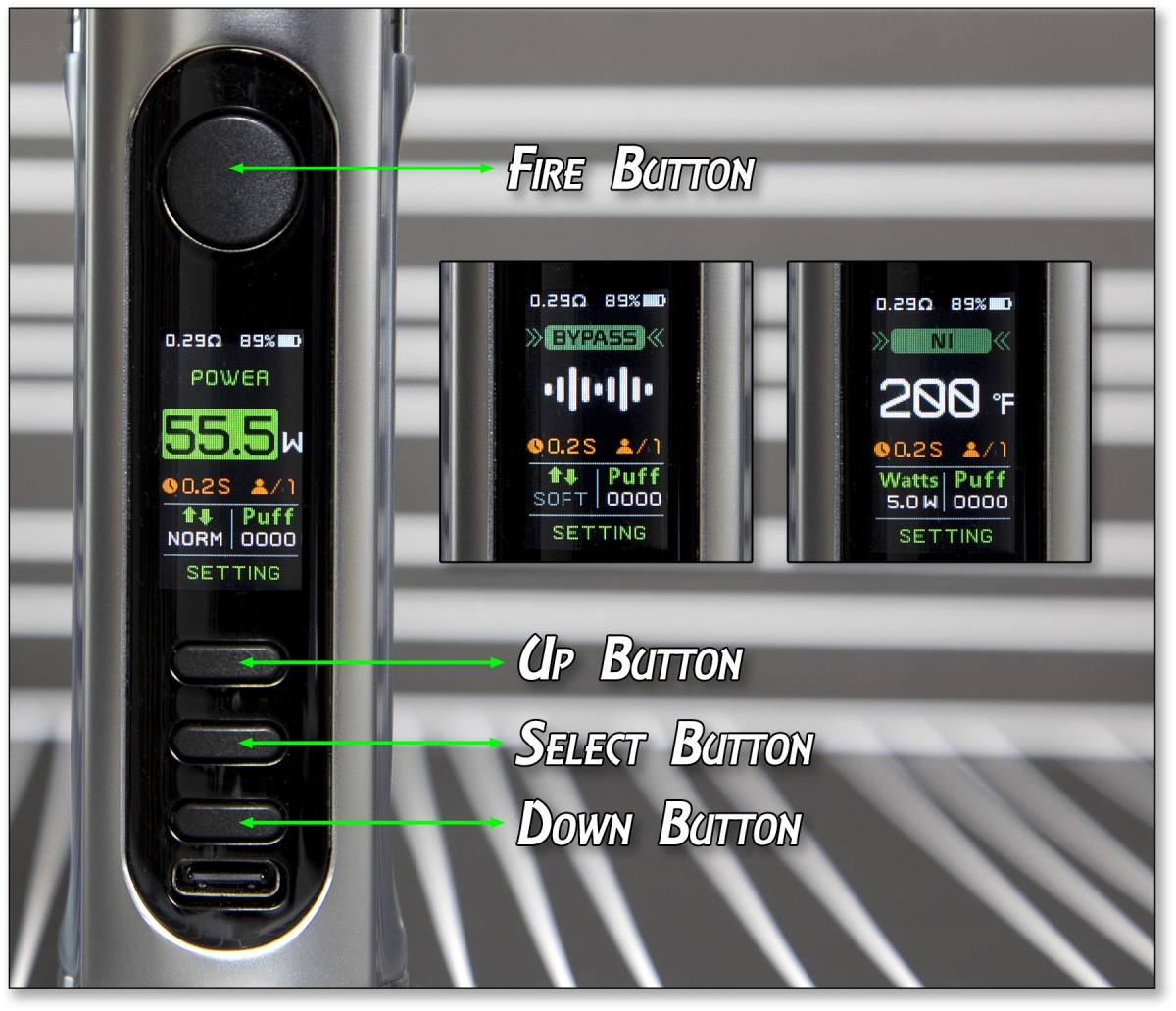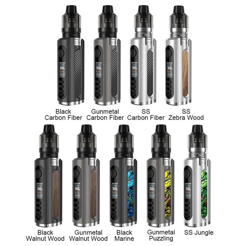 This high-end box mod features easy operation, single 21700/20700/18650 (Not Supplied) battery support, Type-C charging, temperature control adjustments, power mode, a full-color display screen with changeable themes, 100 watts of power, 30mm atomizer compatibility, and multiple protections The chassis is available in either black, stainless steel, gunmetal, each with three different inlays for a total of nine options. At the top of the unit, you can see a tough 510 stainless steel bezel that is compatible with atomizers up to 30mm diameter. This makes the mod quite versatile and allows it to function with the majority of builds and tanks in the marketplace.