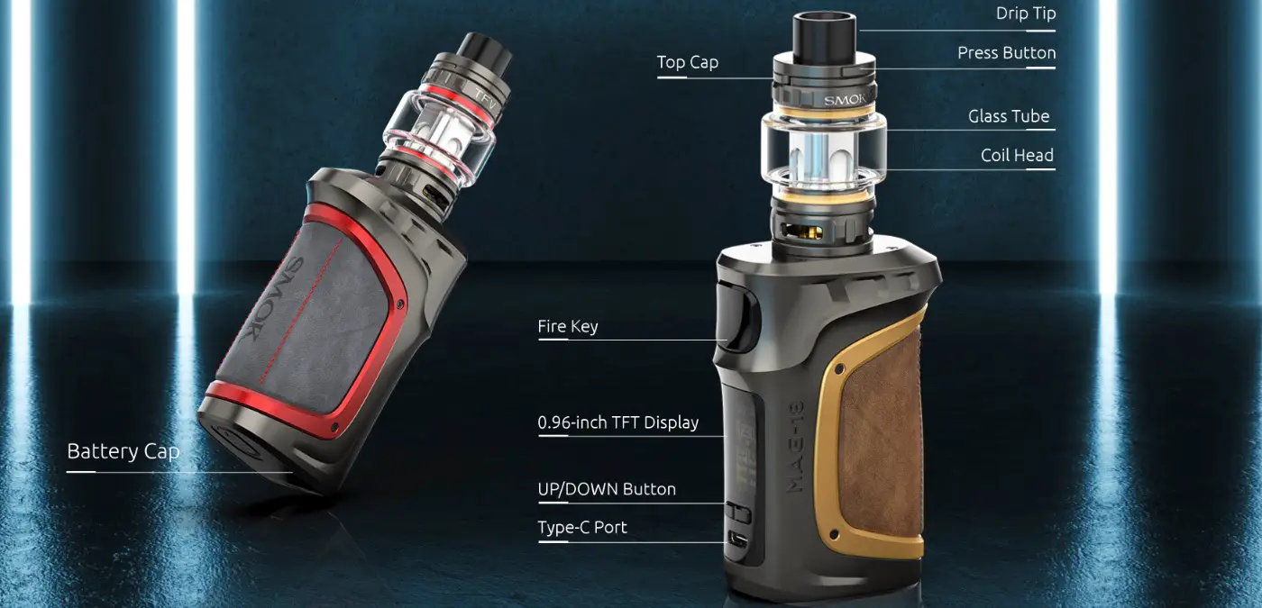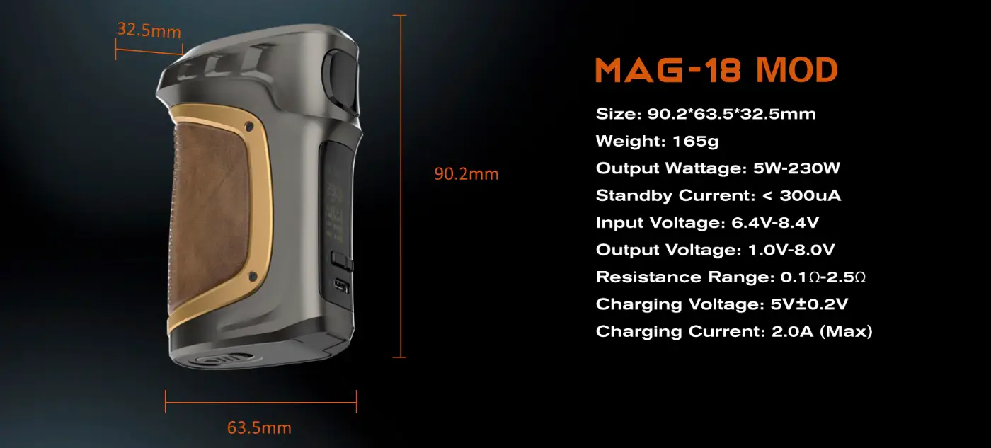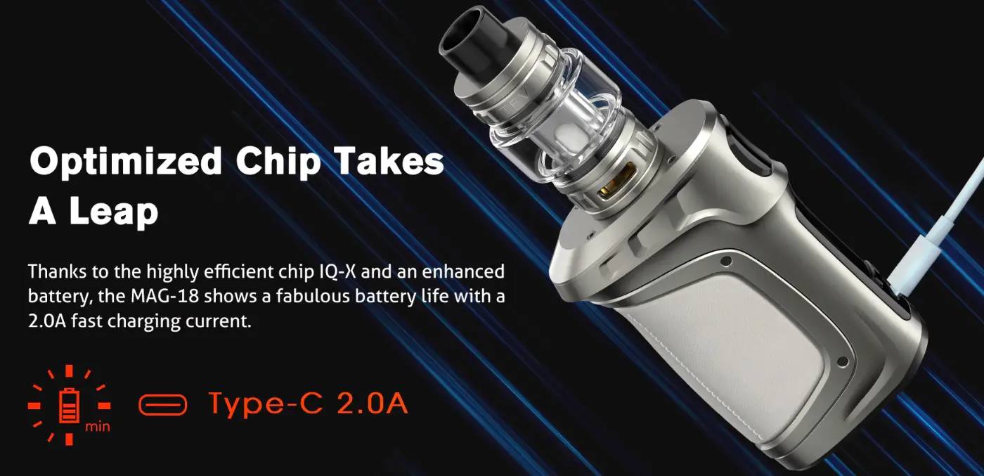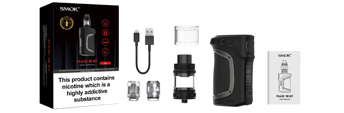 The Smok MAG-18 Kit is a high-performance device that’s perfect for sub-ohm vaping and a DTL (direct-to-lung) inhale. It is powered by two 18650 batteries (not included) and produces a maximum power output of 230W. This kit arrives with a 2ml TFV Mini V2 Tank and two TFV Mini V2 Coils.